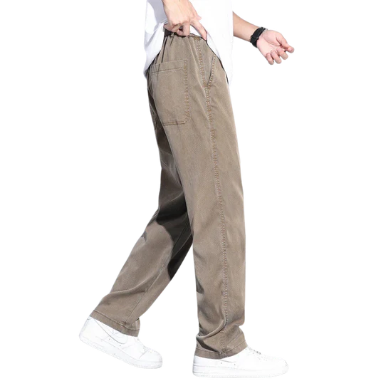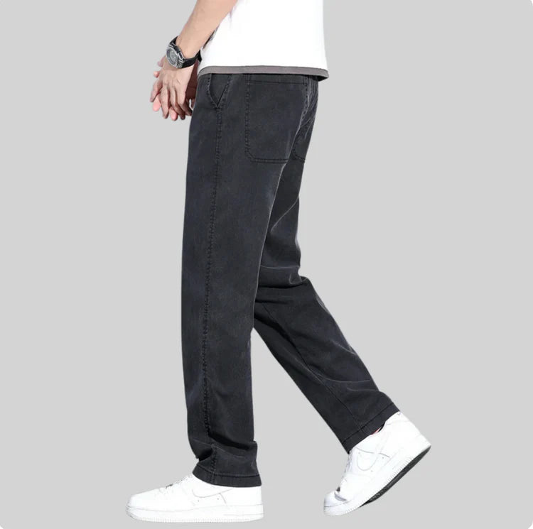 Crafted with new soft fabric denim, these trousers feature an elastic waist and loose straight cut to ensure the perfect fit.